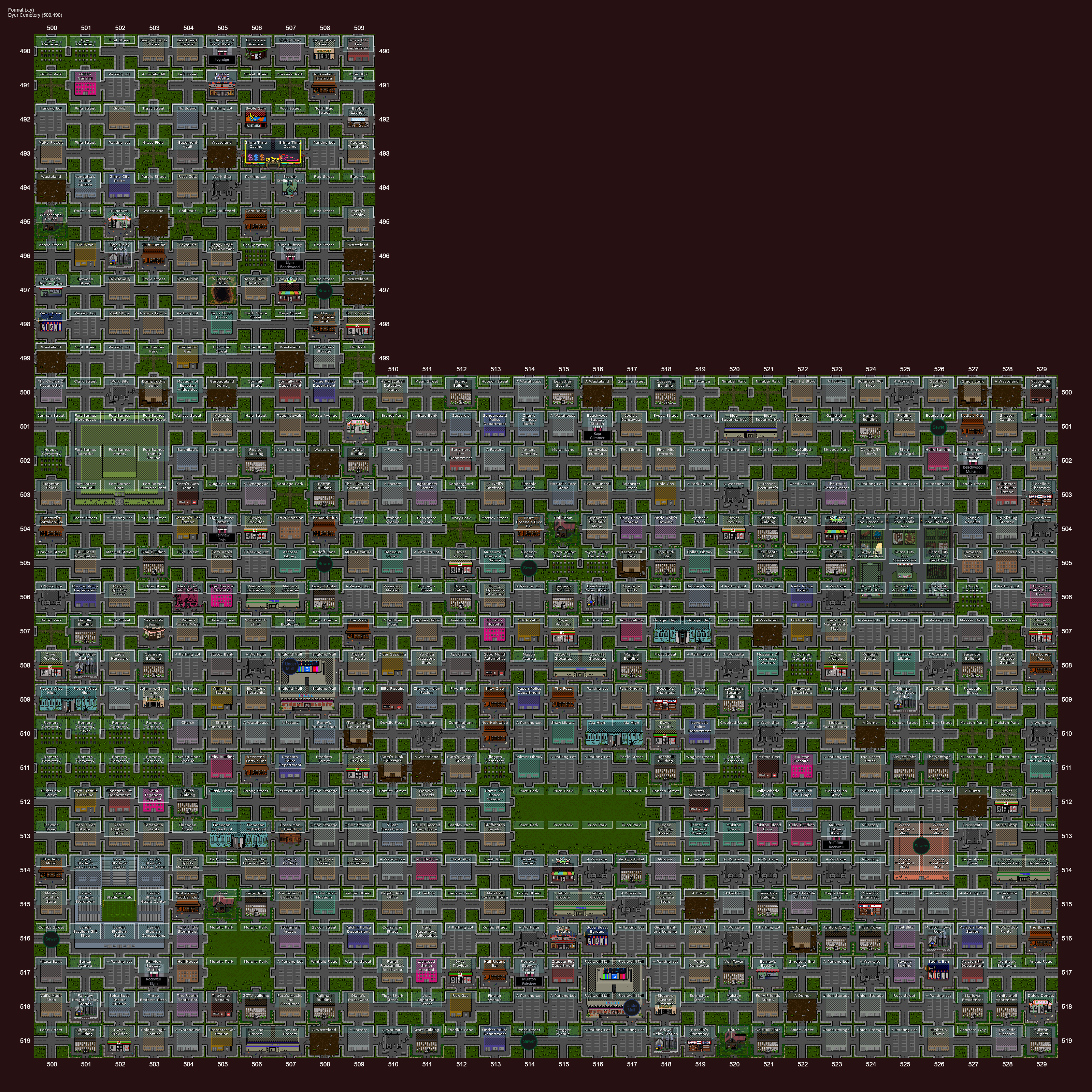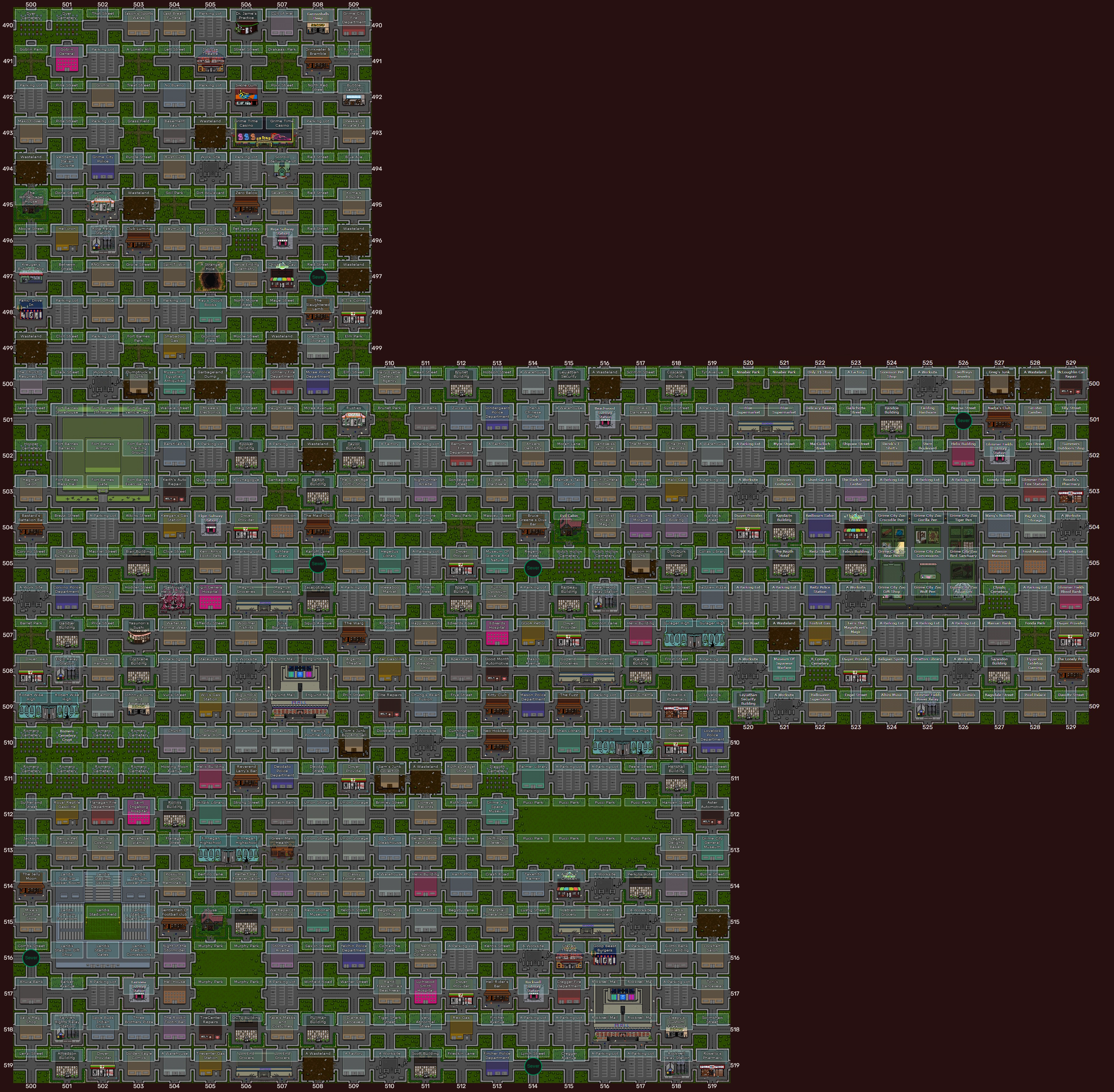 A full map of Grime City with important landmarks