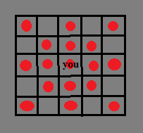 Its range includes all squares around you, and an extra square in a straight line N,S,E,W,NW,NE,NW,SE,SW.